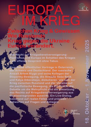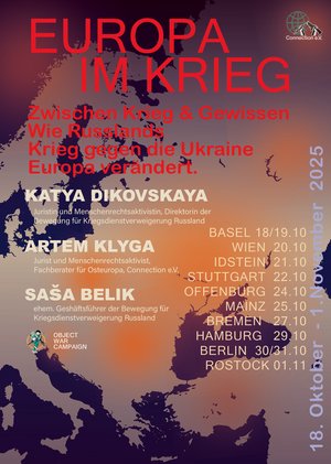Die Referenten sprechen darüber, wie der Krieg zwischen Russland und der Ukraine das pazifistische Denken, die EU-Politik, die Idee der Wehrpflicht und das Recht auf Kriegsdienstverweigerung verändert. Sie berichten über die Arbeit der Bewegung der Kriegsdienstverweiger:innen / Движение сознательных отказчиков от военной службы und erläutern die Kooperation mit Connection e.V. – eines in Offenbach ansässigen Vereins, der sich transnational für die Rechte von Kriegsdienstverweiger:innen einsetzt.