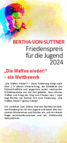 Das DFG-VK Bildungswerk Hessen schreibt den Bertha-von-Suttner-Friedenspreis für die Jugend aus zusammen mit DFG-VK Hessen, DFG-VK Frankfurt, GEW Hessen, Katholischer Jugend Frankfurt, Pax Christi Rhein-Main, Zentrum Oekumene der EKHN und der EKKW