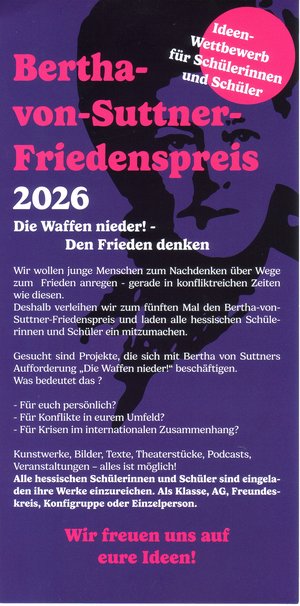 Wir verleihen zum fünften Mal den Bertha-von-Suttner-Friedenspreis für die Jugend und laden alle hessischen Schülerinnen und Schüler ein mitzumachen. Denn wir wollen junge Menschen zum Nachdenken über Wege zum Frieden anregen - gerade in konfliktreichen Zeiten wie diesen.